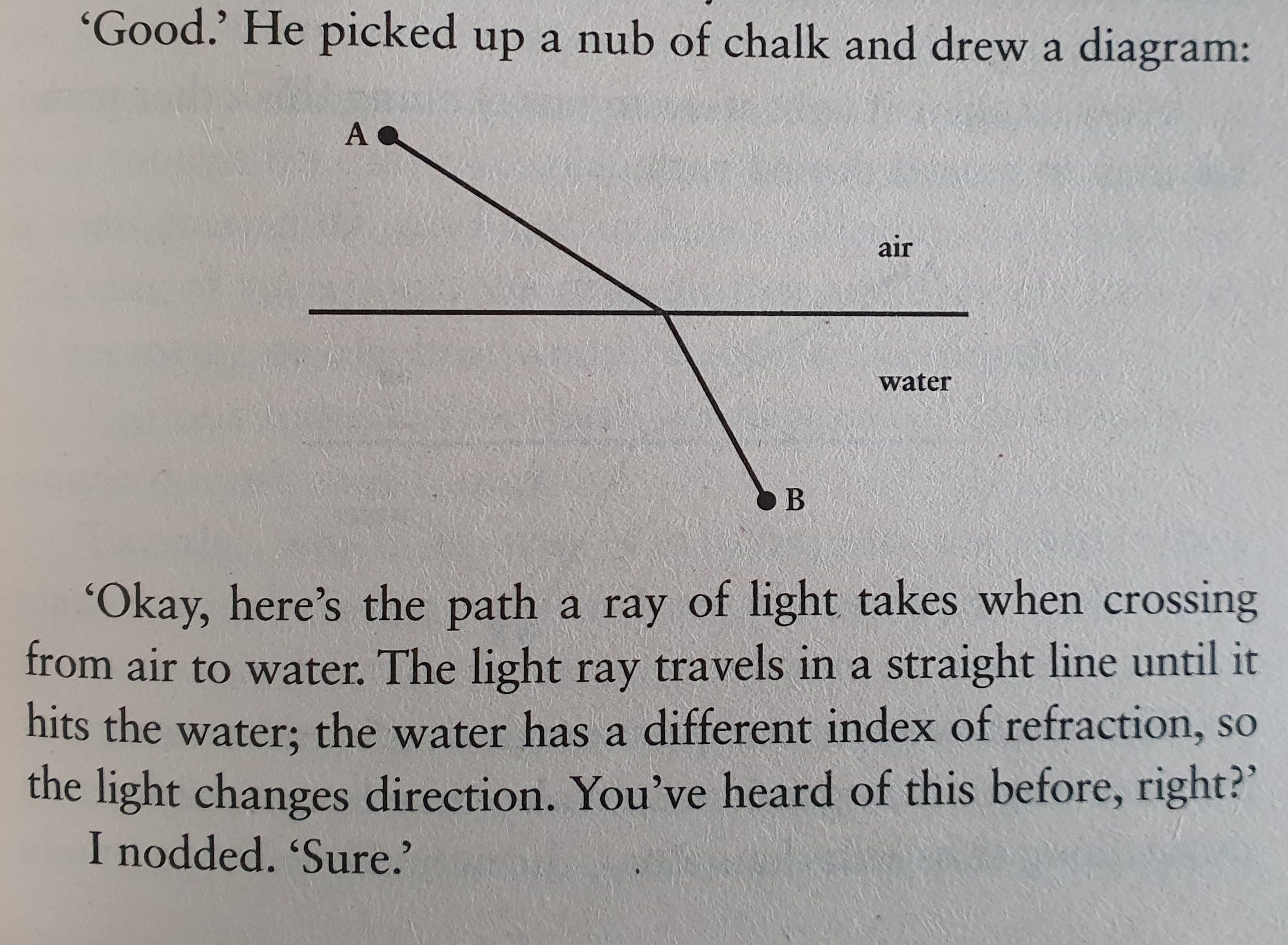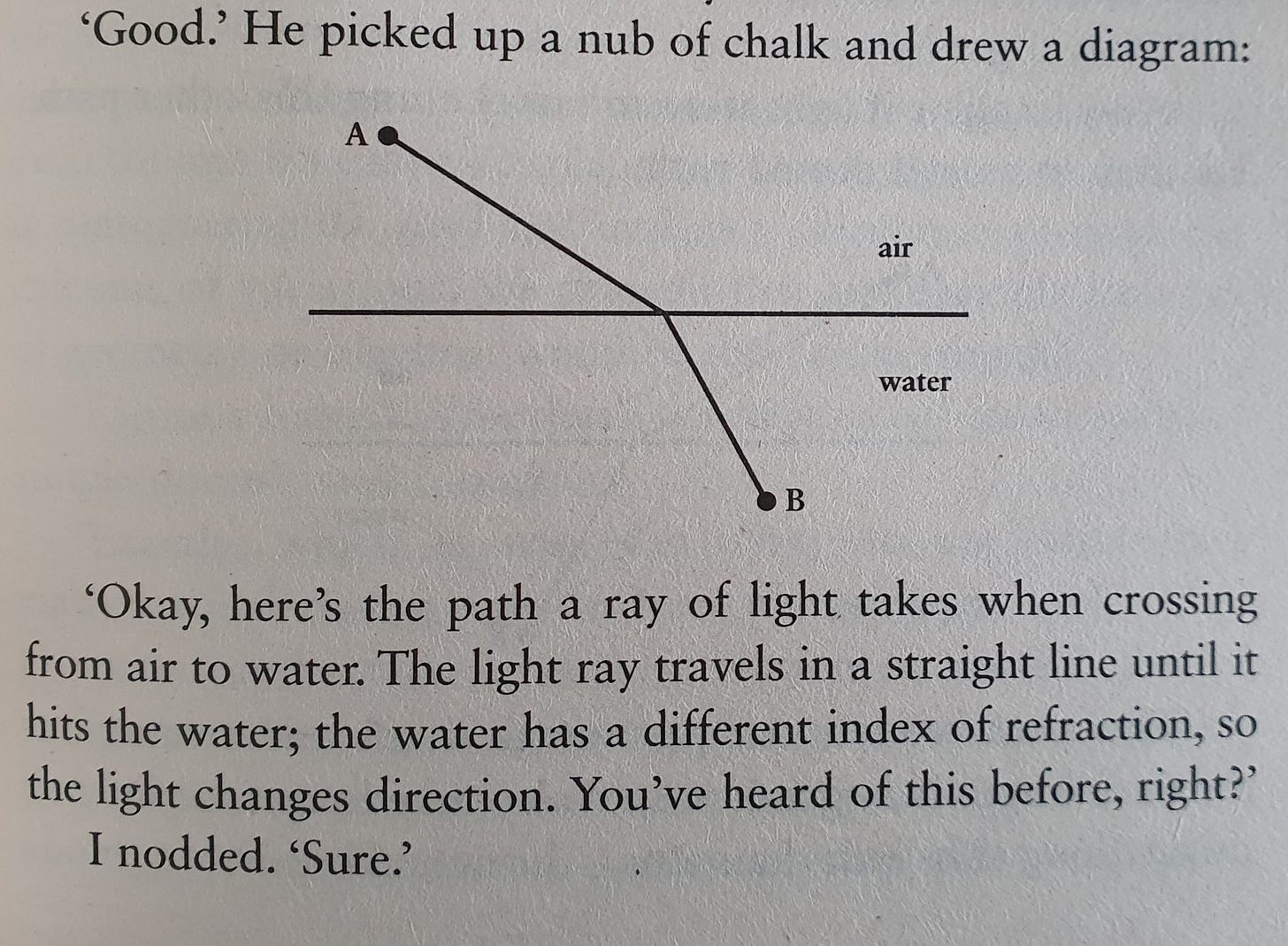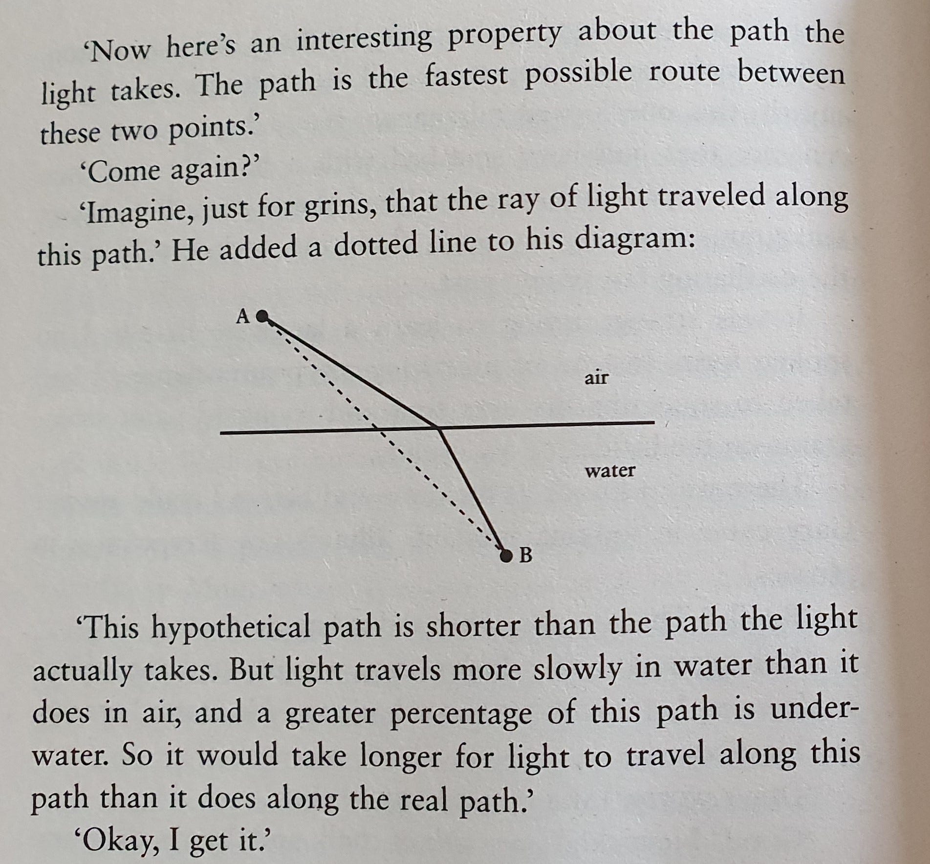 I do not wish to spoil anything. There is a twist that is thought-provoking and heartbreaking at the same time. The short story follows two scientists, a linguist and a physicist, who attempt to decipher and understand an obscure alien language. Insights from both linguistics and physics abound. And it is the latter that are elegantly presented to both the main character and the reader. One memorable – and illustrated – example involves Fermat’s principle of least time: