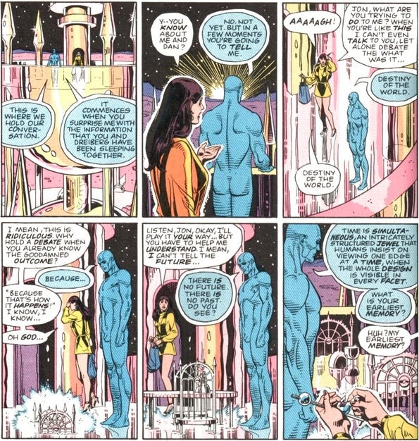One of the central characters in the graphic novel is Dr. Manhattan. He is one of the least relatable characters in a book full of difficult-to-relate-to assholes and losers. One of the things that makes him insufferable and outright inhuman is that he perceives time very differently from the way humans do.